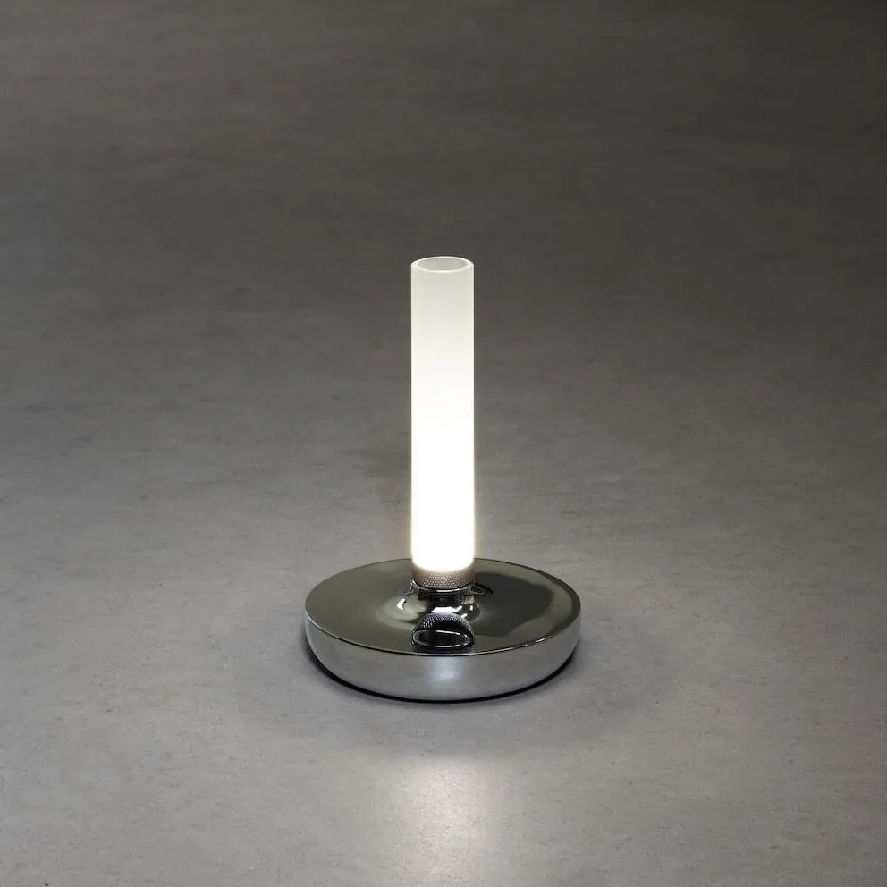 Biarritz 7827-003 rond RGB chroom 20,5×13,5 hxb * Draadloze USB oplaadbare lounge/tafellamp 20,5cm, voor binnen of buitengebruik; * 9u draadloos licht op 100% (18u/50%); max 6u laadtijd; * Incl separaat dockingstation en 1.5m USB-C kabel; * Werkt ook terwijl op docking station; * Centrale touchswitch voor alle functies * Keuze uit drie warmwitte lichttemperaturen 1800K, 2700K of 4000K; * (extra) warmwitte LED; * Dimbaar 10-100% Lichtopbrengst 10-54lm; * 2x 3.7V Li-Ion batterij, power consumption 2.5W; * IP-54; * Exclusief adapter DC 5V/1A